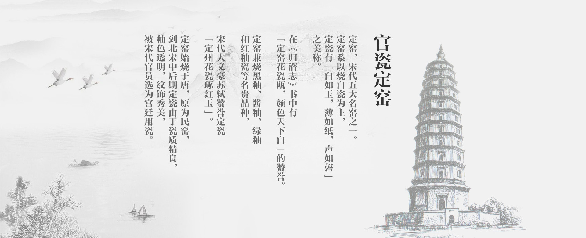 定窯為宋代五大名窯之一,窯址在今河北省曲陽澗滋村、野北村及東西燕村,在宋代屬定州,故名。創(chuàng)燒于唐,極盛于北宋及金,終于元。以產(chǎn)白瓷著稱,兼燒黑釉、醬釉和釉瓷,文獻分別稱其為“黑定”、“紫定”和“綠定”。